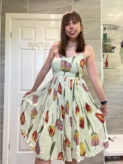 - I also took home another green number from Sue Ryder. I love the tulip pattern that makes it stand out from the usual floral summer dresses. The spaghetti straps and longer, flowy skirt makes it feel vintage, when it is actually from ASOS. I also feel that this dress is more versatile, and I’ll get a lot more wear out of it than the other two. As well as dressing it up with heels for a formal occasion, it would also look cute with trainers or Doc Martins for a fun Y2K, Lily Allen-esque look.